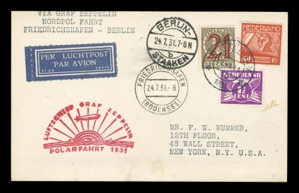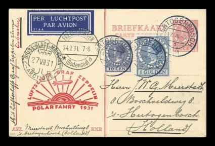 571 c Sieger #119F imageSieger #119F, 1931 Polar Flight, 7 1/2c Red postal card with two additional adhesives tied by "Hertogenbosch/17. VII. 1931" c.d.s., flown on the flight to the Icebreaker "Malyguin", Friedrichshafen transit, backstamped on the Icebreaker on July 27th, red flight cachet, very fine and scarcer leg of the flight (Sieger €450; Michel #204a). (Image) Est. 150-200