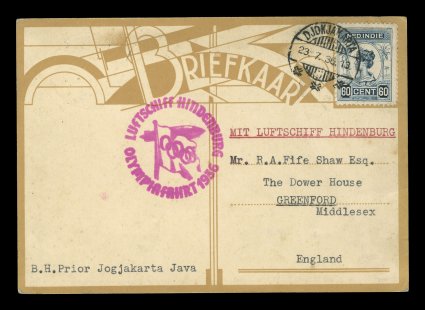 575 c Sieger #427B imageSieger #427B, 1936 Olympic Flight of the "Hindenburg", attractive printed card with 60c Dark blue tied by "Djdkjakarta/23. 7. 36." c.d.s., magenta flight cachet, backstamped Berlin, very fine; not a common treaty-state posting; signed Roger Koerber (Sieger €450; Michel #32Ia). (Image) Est. 200-300