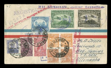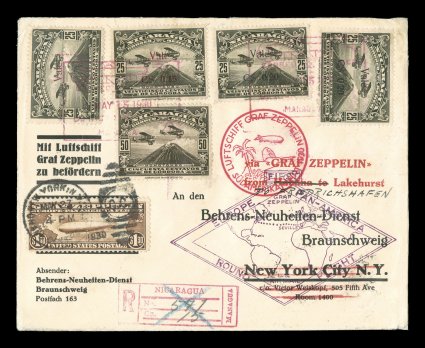578 c Sieger #64IX imageSieger #64IX, 1930 Pan-American Flight, Behrens-Neuheiten-Dienst imprinted registered cover with five Nicaraguan air posts on the front and three adhesives on the reverse, tied by red boxed "Correo Aereo/May 15, 1930,/Managua" pmks. or similar violet c.d.s. on the reverse, this cover was prepared to fly the Zeppelin from Cuba to Lakehurst but when the Zeppelin failed to land at Cuba the cover went by ship to Lakehurst, Cuba transit of May 18, 1930, U.S. $1.30 Zeppelin neatly tied by "New York, N.Y./Grand Central Sta./May 27, 1930" duplex, flown on the return flight from Lakehurst to Friedrichshafen, red German and violet American return flight cachets, backstamped Friedrichshafen, a very fine and handsome cover; exceptionally rare with Sieger reporting only eleven mixed franking items flown, this being one of only six covers with the $1.30 Zeppelin stamp (Sieger €1,800; Michel #68Gb). (Image) Est. 2,000-3,000