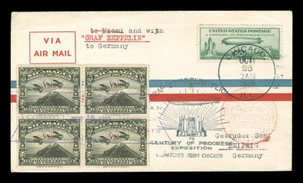 580 c Sieger #245B imageSieger #245B, 1933 Chicago Flight, rare mixed franking cover with Nicaraguan 25c Black brown air post block of four, tied by special violet Managua Pan American Airways cancel for flight to the United States to connect with the Zeppelin, then an impressive perfectly centered jumbo-margined United States 50c Zeppelin single was applied and tied by "Chicago/Ill/Oct. 26 1933" four-bar c.d.s. for the flight to Friedrichshafen, black American Chicago flight cachet, backstamped with green Friedrichshafen Zeppelin machine cancel, extremely fine; this posting is similar to that done from Nicaragua on the 1930 Pan-American Flight and the later First North American Flight of the Hindenburg; very rare and seldom encountered (Sieger €1,250; Michel #355E). (Image) Est. 750-1,000