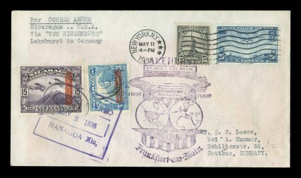 581 c Sieger #409V imageSieger #409V, 1936 First North America Flight of the "Hindenburg", attractive mixed franking cover for the return flight, two adhesives of Nicaragua tied by boxed Managua handstamp of May 2,1936, plus two United States adhesives tied by New York machine cancel, neatly positioned violet United States flight cachet, backstamped Frankfurt with Zeppelin machine cancel, very fine; a rare and desirable cover (Sieger #€900; Michel #13). (Image) Est. 500-750