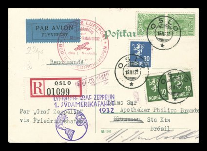 582 c Sieger #138B imageSieger #138B, 1932 First South America Flight, five adhesives tied to card by "Oslo/18 III 32" c.d.s., violet flight cachet and red Berlin connecting flight cachet, backstamped Feorianopolis on March 25th and receiving a Brazil cachet on the reverse in the same color ink, then backstamped Blumenau, Brazil where it was addressed, very fine and unusual (Sieger €400; Michel #234b). (Image) Est. 200-300