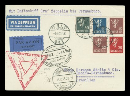583 c Sieger #238Aaa imageSieger #238Aaa, 1933 Chicago Flight, colorfully franked card with five different adhesives tied by ""Oslo/Br. I/6 10 33" c.d.s., Berlin-Sassnitz railroad oval and Friedrichshafen transit c.d.s., red German flight cachet, backstamped Pernambuco, very fine (Sieger €450; Michel #347a). (Image) Est. 200-300