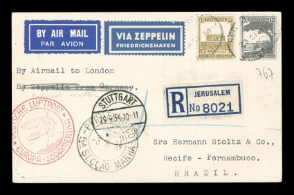 591 c Sieger #247Aa imageSieger #247Aa, 1934 First South America Flight, registered cover with four adhesives tied by "Registered/Jerusalem/18 MY 34" ovals, with Stuttgart transit but routed through Friedrichshafen with transit c.d.s., general red flight cachet with index letter "b", backstamped Pernambuco, very fine and rare cover (Sieger €1,800; Michel #362a). (Image) Est. 1,000-1,500