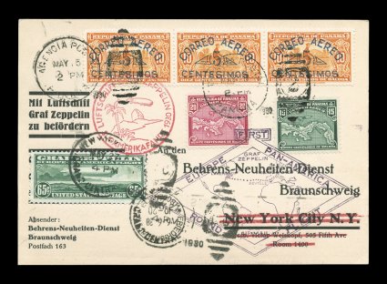 594 c Sieger #64X imageSieger #64X, 1930 Pan-American Flight, Behrens-Neuheiten-Dienst imprinted card with five Panamanian air posts tied by red boxed "Agencia Postal/Panama/May 5, 1930" duplexes, this card was prepared to fly the Zeppelin from Cuba to Lakehurst but when the Zeppelin failed to land at Cuba the cover went by ship to Lakehurst, with Cuba transit of May 18, 1930, U.S. 65c Zeppelin tied by "New York, N.Y./Grand Central Sta./May 27, 1930" duplex, flown on the return flight from Lakehurst to Friedrichshafen, red German and violet American return flight cachets, backstamped Friedrichshafen, very fine; a rare posting out of Panama with only a few covers and cards known (Sieger €1,500; Michel #68Gb). (Image) Est. 750-1,000