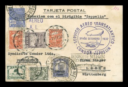 599 c Sieger #184A imageSieger #184A, 1932 Seventh South America Flight, mixed franking card with five Peruvian singles tied by "Lima/7 Sep. 32" c.d.s., then with two Brazilian adhesives including the 3,500r Zeppelin overprint tied by Rio de Janeiro c.d.s. of September 29th for the return flight, violet flight cachet, backstamped Friedrichshafen, very fine and a scarce Peru posting (Sieger €900; Michel #281A). (Image) Est. 300-400