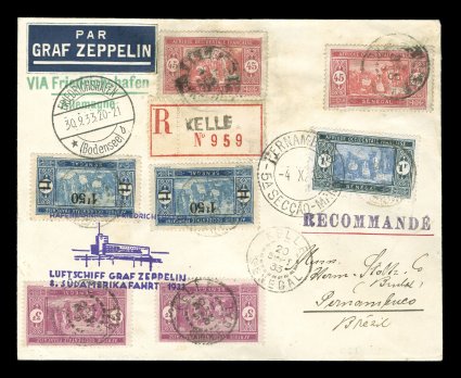 661 c Sieger #235Aa imageSieger #235Aa, 1933 Eighth South America Flight, handsome registered cover with twelve adhesives on front and back, all tied by "Kelle/Senegal/20 Sept 33" c.d.s., violet flight cachet, Friedrichshafen transit c.d.s., Pernambuco receiving c.d.s. on the front, fresh and very fine; a rare and desirable cover from this French colony; ex-Belinkoff (Sieger €1,000; Michel #343a). (Image) Est. 750-1,000