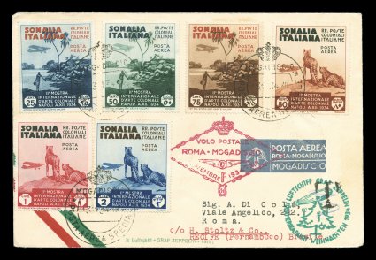 663 c Sieger #286Ba imageSieger #286Ba, 1934 Twelfth South America Flight (Christmas Flight), attractively franked cover with full set of the Second Colonial Arts Exhibition air posts of six values, all tied by special crown "Mogadiscio/Posta Aerea Speciale/13. 11. 34" c.d.s., red flight cachet for the Rome-Mogadiscio flight, connecting with the Zeppelin through Stuttgart with green flight cachet with index letter "c" for the Stuttgart connection, backstamped Pernambuco, very fine; a lovely cover from this popular flight (Sieger €750; Michel #418c). (Image) Est. 500-750