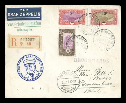 668 c Sieger #235Aa imageSieger #235Aa, 1933 Eighth South America Flight, a rare registered cover from the popular Somali Coast, two singles tied by "Cote Fss des Somalis/Djibouti/12 Sep 33" c.d.s., violet flight cachet, via Marseilles to Friedrichshafen with transit c.d.s., backstamped Pernambuco, light vertical edge bend at right, very fine (Sieger €800; Michel #343a). (Image) Est. 750-1,000