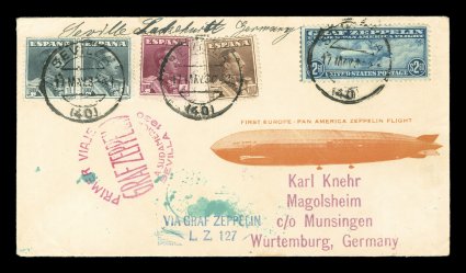 673 c Sieger #58B/64G imageSieger #58B/64G, 1930 Pan-American Flight, rare combination franking for the round trip from Seville to Seville with seven Spanish adhesives tied to cover by "Sevilla/17. May. 30" c.d.s., red Spanish flight cachet, backstamped Lakehurst, then U.S. $1.30 Zeppelin single tied by "New York, N.Y./Varick St. Sta./May 31, 1930 duplex for the return flight with violet American return flight cachet, backstamped Seville, minor edge wear to cover not affecting the stamps or markings; this return flight to Seville is a scarcer leg and particularly so in combination with Spanish franking for this round-trip cover; this cover and the next lot are the only two covers we have seen with Spain and United States franking (Michel #66A/68Ge; not listed thus in Sieger or Michel). (Image) Est. 500-750