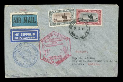 676 c Sieger #202B imageSieger #202B, 1933 First South America Flight, two air posts tied to cover by "Sudan Air Mail/Wadi-Halfa/25. IV. 33." c.d.s., blue flight cachet and Berlin connecting flight cachet, backstamped Santos, slight edge wrinkles and staining to cover, otherwise very fine; a rare Zeppelin cover from this country, this being the first flight listed by Sieger (Sieger €1,250; Michel #294b). (Image) Est. 500-750