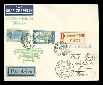 678 c Sieger #214Aa imageSieger #214Aa, 1933 Second South America Flight, handsome registered cover with two singles tied by "Tombouctou/Soudan-Francais/11 Mai 33" c.d.s., green flight cachet, via Bamako, Dakar and Paris to Friedrichshafen with transit c.d.s., backstamped Arica, Peru, very fine with all markings clear and sharp; a rare Zeppelin cover from this French colony (Sieger €1,850; Michel #305a). (Image) Est. 1,000-1,500