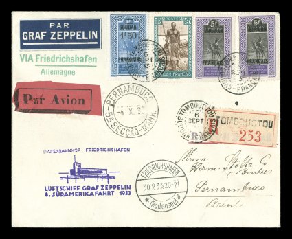 679 c Sieger #235Aa imageSieger #235Aa, 1933 Eighth South America Flight, an especially attractive registered cover with four stamps tied by "Tombouctou/Soudan Francais/6 Sept 33" c.d.s., neatly positioned violet flight cachet, Friedrichshafen transit c.d.s and Pernambuco receiving c.d.s., all on the front, choice very fine; a select and very rare cover from a French colony where all of the few known flights are rare (Sieger €1,400; Michel #343a). (Image) Est. 1,000-1,500