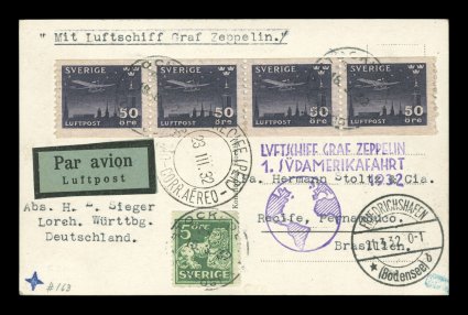 682 c Sieger #138Aa imageSieger #138Aa, 1932 First South America Flight, photo card attractively franked with strip of four of 50o Deep violet air post and one other adhesive, both tied by Stockholm c.d.s., Friedrichshafen transit c.d.s., violet flight cachet, backstamped Rio de Janeiro, very fine with all markings on the address side (Sieger €600; Michel #234a). (Image) Est. 200-300