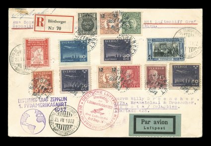 683 c Sieger #138Aa var. imageSieger #138Aa var., 1932 First South America Flight, an impressive triple mixed franking for onward air transmission from Brazil into Colombia, attractively franked with eleven Swedish adhesives tied by "Blotberget/18. 3. 1932" c.d.s. for the Zeppelin flight from Friedrichshafen to Pernambuco where backstamped, violet flight cachet, plus mixed franking with Colombian 4c Blue and black and 6c Ribon Express stamp, both tied by Barranquilla c.d.s. to its final destination in Bogata, very fine and exceptionally attractive; this cover was forwarded from Brazil to New York, then by air to Atlanta, Ga. and on to Colombia; a most interesting combination usage and not mentioned by either Sieger or Michel (Michel #234a var.). (Image) Est. 500-750