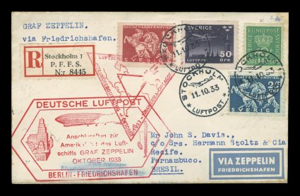 684 c Sieger #238E imageSieger #238E, 1933 Chicago Flight, registered cover with four adhesives tied by "Stockholm/Luftpost/11. 10. 33" c.d.s., red German flight cachet and Berlin connecting flight cachet, backstamped Pernambuco, trace of edge toning, very fine (Sieger €400; Michel #347b). (Image) Est. 200-300
