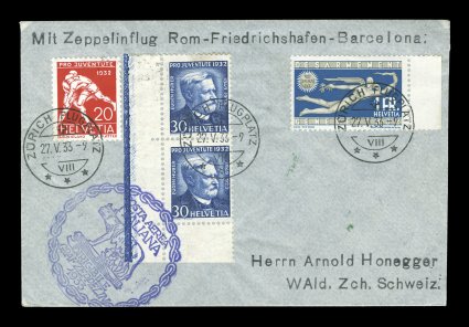 689 c Sieger #207 imageSieger #207, 1933 Italian Flight, four adhesives tied by "Zurich Flugplatz/27. V. 33" c.d.s., posted on the flight around Rome and back to Friedrichshafen through the Italian post office (should be Sieger #208), violet Italian flight cachet, Rome machine cancel and backstamped with special green Friedrichshafen Zeppelin pmk., very fine (Sieger €750 as #207 for this specific posting; Michel #304Aa). (Image) Est. 200-300