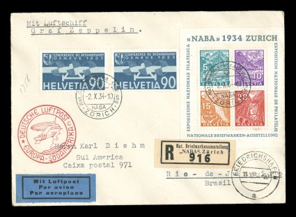 690 c Sieger #280Aa imageSieger #280Aa, 1934 Tenth South America Flight, attractively franked registered cover with two air posts and 1934 NABA souvenir sheet, both tied by the special Zurich exhibition cancel of October 2, 1934, Friedrichshafen transit c.d.s., general Zeppelin flight cachet with index letter "c", backstamped Pernambuco, very fine (Scott $550.00 for used souvenir sheet; Michel #410a). (Image) Est. 400-500