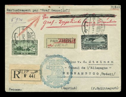 693 c Sieger #207 imageSieger #207, 1933 Italian Flight, an extraordinarily rare registered cover with six adhesives on front and back tied by "Alep/16. 5. 33" bilingual c.d.s., flown on the flight around Rome via the Italian post office (should be Sieger #208), blue green Italian cachet with Rome Zeppelin machine cancel backstamp, then on the Second South America Flight to Brazil, backstamped Pernambuco, vertical fold to cover prior to the preparing of the cover and posting so not affecting the stamps or labels, otherwise very fine; Sieger lists this as the rarest of the five flights that are known from this country with only a very few known (Sieger €2,800 as #207; Michel #304Aa; €2,500 for this specific posting). (Image) Est. 1,000-1,500