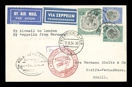 694 c Sieger #280Aa imageSieger #280Aa, 1934 Tenth South America Flight, three adhesives tied to nice card by "Dodoma/4 OC 1934" c.d.s., to Friedrichshafen with Koln-Herbesthal railway transit oval on front and back, Friedrichshafen transit c.d.s. and general Zeppelin flight cachet with index letter "c", backstamped Pernambuco, very fine; an exceptionally difficult country from which to acquire a Zeppelin cover as only the 1933 Chicago Flight and this 1934 flight are recorded by Sieger from this country, attractive and rare card; ex-Belinkoff (Sieger €1,650; Michel #410a). (Image) Est. 1,000-1,500