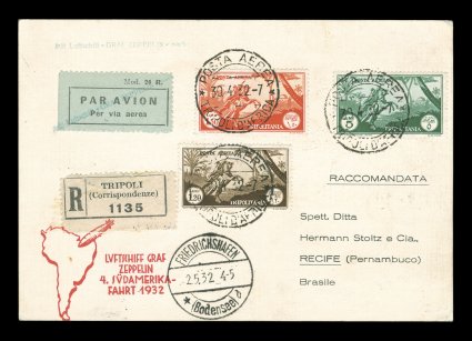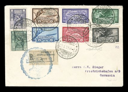697 c Sieger #183Aa imageSieger #183Aa, 1932 Seventh South America Flight, registered card attractively franked with seven adhesives of Italian Colonies issue, Lybia and Tripilotania, all tied by "Posta Aerea/Tripoli d'Africa/22. 9. 32" c.d.s., Friedrichshafen transit c.d.s., brown flight cachet, backstamped Pernambuco, very fine (Sieger €350; Michel #279a). (Image) Est. 200-300