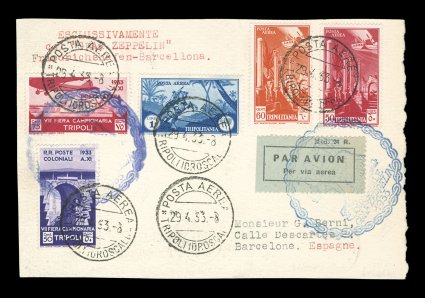 700 c Sieger #213 var. imageSieger #213 var., 1933 Italian Flight, attractive card with five air posts (all non-Zeppelin stamps) tied by "Posta Aerea/Tripoliidrosscai/29. 4. 33" c.d.s., flown on the flight around Rome and then on the return flight to Barcelona, possessing two strikes of the Italian flight cachet in blue and violet, backstamped with the Rome machine cancel and with a large Barcelona oval, mounting marks on the reverse, very fine; an extremely rare posting because of its ordinary air post franking as well as being to Barcelona, both characteristics are seldom met with on the Italian Flight (not listed thus in Sieger; Michel #304Fb; €2,000 for this specific usage). (Image) Est. 750-1,000