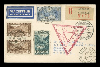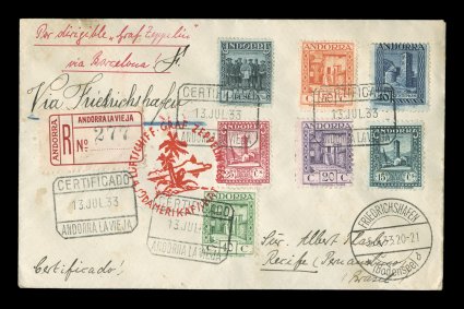 264 c Sieger #223A imageSieger #223Aa, 1933 Fourth South America Flight, a wonderfully pretty registered cover with seven adhesives tied by boxed "Certificado/Andorra la Vieja/13. Jul. 33" pmks., bold red flight cachet, Friedrichshafen transit c.d.s., backstamped Pernambuco, choice very fine; a handsome and rare example of one of the few flights on which covers of Spanish Andorra were posted; 2003 Sieger BPP certificate (Sieger €1,350; Michel #323a). (Image) Est. 750-1,000