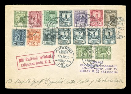 263 c Sieger #64XVa imageSieger #64XVa, 1930 Pan-American Flight, sixteen adhesives attractively franking a cover for the return flight from Seville to Friedrichshafen, all tied by "Andorra/Correos/Andorra la Vieja/17. Abr. 30" c.d.s., Seville transit of June 2nd where it boarded the Zeppelin and backstamped Friedrichshafen, plus boxed connecting flight cachet to Berlin, slight edge wear and soiling as usual on these rare covers, very fine (Sieger €1,000; Michel #68Ad). (Image) Est. 1,000-1,500