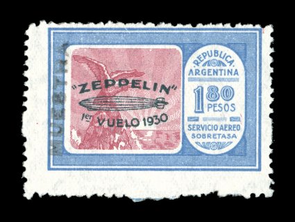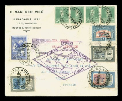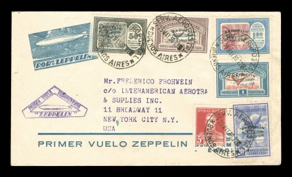 273 c Sieger #63E-G imageSieger #63E-G, 1930 Pan-American Flight, impressive large cacheted full set cover to Friedrichshafen with 20c-3.60P Green Zeppelin overprints cplt., includes two examples of each of the four low values and one of the key 1.80P value, all tied by "Serv. Aeropostal/Buenos Aires/21. May. 30." c.d.s., violet American flight cachet, backstamped Friedrichshafen, very fine; with so few issued of the 1.80P value with green overprint flown covers are of the greatest rarity and especially in this format to Europe (Image) Est. 1,000-1,500