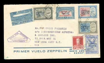 271 c Sieger #63A-D imageSieger #63A-D, 1930 Pan-American Flight, business corner card cover with full set of the 20c-3.60P Blue Zeppelin overprints, all tied by "Aeropostal-B.A./Argentina/21. May. 30." c.d.s., violet American flight cachet, addressed to The National City Bank of New York in France, but it is not backstamped at Lakehurst, Seville or Friedrichshafen, and the first transit is June 9,1930 at Cadiz, so it may have been off loaded at Lakehurst by mistake and transported to Europe by ship, tiny edge tear to cover of no consequence, very fine and attractive full set cover (Sieger €650; Michel probably #66Fa-e). (Image) Est. 200-300