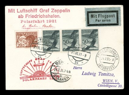 276 c Sieger #119D imageSieger #119D, 1931 Polar Flight, four air posts tied to card by "Wien/21. VII. 31" c.d.s., Friedrichshafen transit and flown on the leg to Berlin, backstamped on July 24th, red flight cachet, trivial nibbed corners from corner mounts, very fine; only 72 items of Austria flown on this leg (Sieger €400; Michel #202). (Image) Est. 150-200