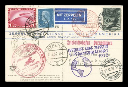 277 c Sieger #138B imageSieger #138B, 1932 First South America Flight, attractive portrait card of Dr. Eckener with 50g Blue grey air post tied by Vienna air field c.d.s., in mixed franking with German 1M Zeppelin single and one other adhesive tied by Berlin c.d.s., violet flight cachet and red Berlin connecting flight cachet, backstamped Pernambuco, very fine with all the markings on the address side of the card (Sieger €400; Michel #234b). (Image) Est. 150-200