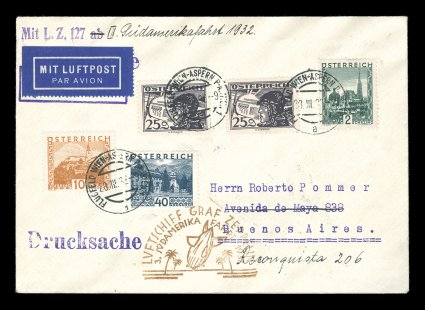 279 c Sieger #150Aa imageSieger #150Aa, 1932 Third South America Flight, mixed franking cover with five Austrian adhesives on the front tied by Vienna air field cancels, plus strip of three of the German 50pf Orange air post and one other adhesive tied to the reverse by Friedrichshafen c.d.s., brown flight cachet, backstamped Buenos Aires, very fine and fresh (Sieger €425; Michel #239a). (Image) Est. 200-300