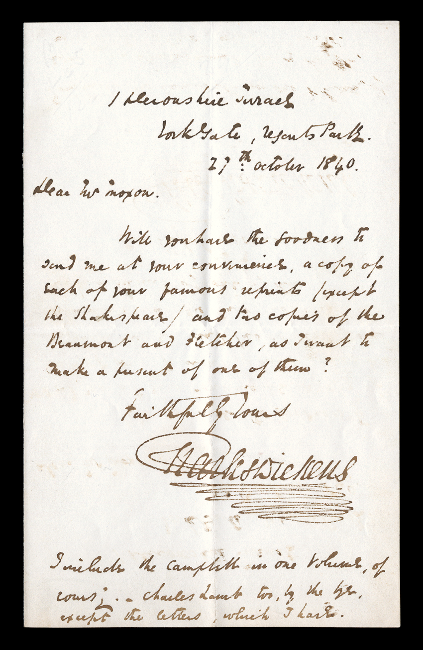 and signed by Dickens also accompanying, the letter dated 27#1, 1840 1p Black, plate 6, lettered P-F tied to petite cover by black Maltese Cross, signed by Charles Dickens at bottom left of the cover, with the original letter handwritten and signed by Dickens also accompanying, the letter dated 27th October 1840 and reads: "Dear Mr. Moxon. Will you have the goodness to send me at your convenience, a copy of each of your famous reprints (except the Shakespeare) and two copies of the Beaumont and Fletcher, as I want to make a present of one of them. Faithfully yours, Charles Dickens", and with postscript "I include the Campbell in one volume; - Charles Lamb too, by the bye, except the letters, which I have", the cover is addressed to publisher Charles Moxon, red boxed London "4 Eg 4/OC 27/2840" backstamp, very fine; not only a scarce and desirable pair of Charles Dickens signatures, but and important showpiece for the Penny Black specialist; illustrated in American Issue (1984, Smithsonian Press). (imagea) (Image) Est. $5,000-7,500