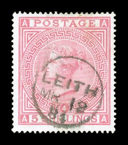 Brandon certificate (S.G. 134 £3,200).#90a, 1882 5/- Rose on white paper, plate 4, nicely centered, rich color, small Leith c.d.s., tiny perforation crease in the bottom left corner, otherwise very fine; clear 2000 Brandon certificate (S.G. #134; £3,200). (Image) $3,250.00