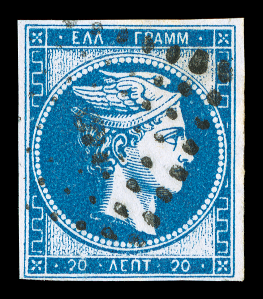 cancelled, nearly very fine for this scarce and seldom seen error (Michel 31#31c, 1870 20l Light blue on bluish, "20" numeral on reverse Inverted, used, four close (at bottom left) to mostly full margins, deep rich color and impression, lightly cancelled, nearly very fine for this scarce and seldom seen error (Michel #31a var.). (imagea) (Image) $525.00