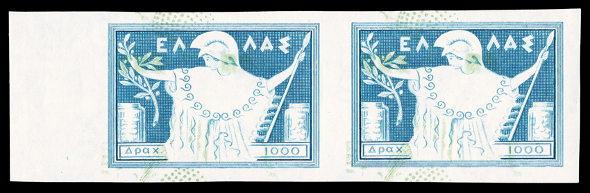 imperforate, although the Scott catalog only lists the 1,000D imperforate pair a#551a var., 553 var., 1953 1,000d Olive oil and 2,000d Figs, imperforate pairs, each with light green Background Inverted, the two values from the set that are found imperforate, although the Scott catalog only lists the 1,000D imperforate pair and not with the inverted background, both are horizontal pairs and each has huge margins, o.g., 1,000D lightly hinged, 2,000D never hinged, extremely fine and scarce (Michel #598 var., 600 var.). (imagea) (Image) Est. $400-500