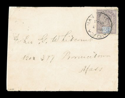 2021 c S.G. #Z8 imageS.G. #Z8, 2 1/2p Dull purple and blue, tied to large portion of a cover to Provincetown, Mass. by an especially clear strike of the black "Grand Cayman/P.O./MY 3 1895" c.d.s. Type Z2 Georgetown pmk., Kingston, Jamaica transit c.d.s. and Provincetown backstamp, cover has been strongly reduced at left with tears to the reverse and a portion of the backflap missing, quite attractive from the front with only mild edge wear and a faint corner crease to the stamp, very fine appearance; this cancel is found in both violet and black but our observations are that the black cancel is much scarcer than the violet, especially since this is a very early usage of this postmark, an extremely rare cover with only a few examples known, and especially choice with this excellent strike of the Type Z2 postmark of Georgetown in black; ex-Green (Scott #A12). (Image) Est. 4,000-5,000