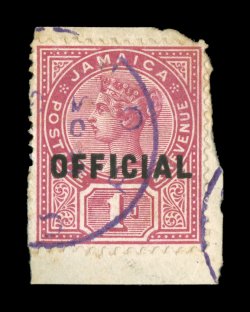 2022 O S.G. #Z19 imageS.G. #Z19, 1p Rose with thick "Official" overprint, tied to small piece by purple single-circle Grand Cayman Type Z2 c.d.s. pmk. of Georgetown showing portions of both "Grand" and and "Cayman", dated 1895, stamp is well centered and fresh with bright color, very fine; an exceedingly rare official stamp used with this Cayman Islands cancel of which only a couple of examples are known; 1983 David Brandon certificate; ex-Green (Scott #A15; $4,400.00). (Image) £3,750