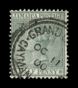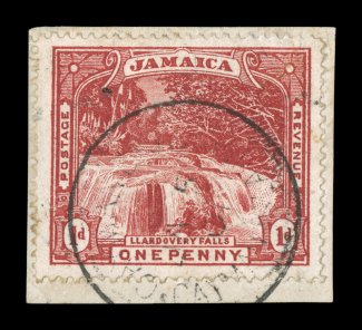 2035 O S.G. #Z27 imageS.G. #Z27, 1p Red, a fresh and well centered single tied to piece by light, but easily discernable strike of "Cayman Brac/Cayman Islands/JA 5 01" double-circle c.d.s., Type Z5 pmk. being the very rare cancel of Stake Bay, Type 2, very fine; while the catalog values do not always reflect it, this postmark is the rarest of all the cancellations on Jamaican stamps, even rarer than the boxed Cayman Brac temporary pmk.; this 1p Red is another value of which only two examples have been recorded; ex-Green (Scott #A27; $3,500.00). (Image) £3,000