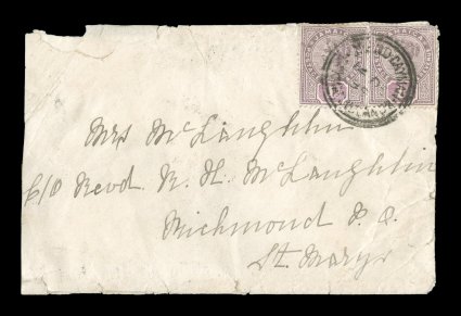 2025 c S.G. #Z11 imageS.G. #Z11, 1p Purple and mauve, two singles tied to cover to Richmond, Jamaica by single full strike of double-circle "Grand Cayman/Cayman Islands/14 DE 99" c.d.s., the Type Z3 pmk. of Georgetown, a similarly nice strike on the reverse, Kingston transit and backstamped Richmond, stamps are well centered, the cover has been reduced at left and has edge faults around barely affecting a few perf. tips on the right stamp, a fine cover; at this period covers from the Cayman Islands could be sent to Jamaica at domestic British rates, making this an unusually rare double rate cover, this also explains the edge faults which were undoubtedly caused by a large enclosure within a none too sturdy envelope; covers with Jamaican stamps are of great rarity regardless of condition and it is thought that only seven covers are recorded with the double-circle Type Z3 postmark from the Cayman Islands with Jamaican stamps; ex-Green (Scott #A18). (Image) Est. 3,000-4,000