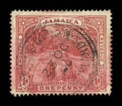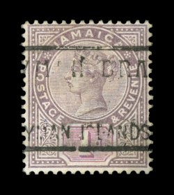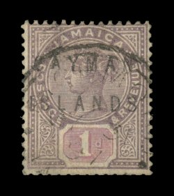 2038 E imageJamaica 1889 1p Purple and mauve with "Cayman/Islands" overprint in capital letters, the very rare overprint essay or unissued overprint, an interesting used single with a portion of a Richmond, Jamaica cancel dated May 31, 1897, perforations slightly clipped at bottom, fine; the use of this stamp is shrouded in mystery as much as the overprint itself, this cancel may have been applied by favor or it may have been used by someone who came across the stamp not recognizing the overprint, in any case this example and the unused example in the previous lot are the only known surviving examples of these Cayman Islands rarities; these two stamps are specifically mention in the Stanley Gibbons introduction to Cayman Islandss, but are not listed; photocopy of 1988 Peter Holcombe certificate for the two stamps; ex-Meredith. (Image) Est. 4,000-5,000