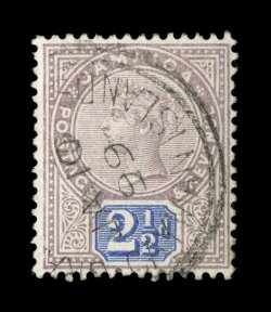 2027 O S.G. #Z13 imageS.G. #Z13, 2 1/2p Dull purple and blue, crisp single with excellent strike of the double-circle Grand Cayman Type Z3 c.d.s. pmk. of Georgetown, showing full "Cayman Islands" from the bottom of the cancel, dated January 10, 1899, choice very fine; exceptionally scarce with this clear and well struck cancel; 1971 RPS certificate; ex-Green (Scott #A20; $800.00). (Image) £700