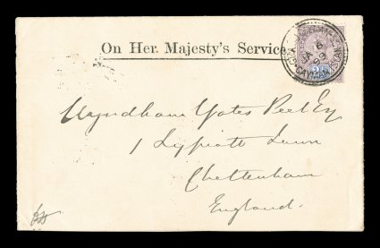 2028 c S.G. #Z13 imageS.G. #Z13, 2 1/2p Dull purple and blue, a remarkably choice O.H.M.S. cover to England, with a lovely well centered single possessing fresh bright colors, neatly tied by a beautifully struck "Grand Caymans/Cayman Islands/JA 6 99" double circle Type Z3 postmark of Georgetown, one could hardly ask for a clearer strike of this difficult cancel, plus an additional equally well struck example on the reverse, Kingston, Jamaica transit c.d.s. and backstamped Cheltenham, opened out for display, an extremely fine cover in all regards for this Jamaican forerunner; this cover is truly exceptional, not just for its rarity, which is substantial as it is believed that only seven covers with the Type 3 postmark are recorded, but for its remarkable condition, when compared to the vast majority of Cayman Islands covers with Jamaican franking that have been reduced and have all manner of faults, plus often with weak or poorly struck cancels, it is impressive to find a cover that has none of these maladies, a wonderful Cayman Islands forerunner rarity; 1974 BPA certificate; ex-Green (Scott #A20). (Image) Est. 7,500-10,000