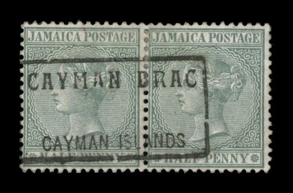 2029 O S.G. #Z21 imageS.G. #Z21, 1/2p Green impressive horizontal pair with virtually full strike of "Cayman Brac/Cayman Islands" boxed handstamp, Type Z4 pmk. and the first cancel used at Stake Bay, Type 1, beautifully clear and sharp impression, very fine; this boxed cancel is the type of temporary postmark that was issued to newly opened post offices in Jamaica, all values are extremely rare with this marking, much more so than the cancels of Georgetown, and this example is particularly desirable on a pair which can show the full marking; ex-Green (Scott #A21; $7,000.00+). (Image) £6,000+