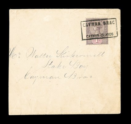 2031 c S.G. #Z22 imageS.G. #Z22, 1p Purple and mauve, a lovely fresh single with rich bright colors, neatly tied to cover by vivid and intense strike of the boxed "Cayman Brac/Cayman Islands" handstamp, Type Z4 pmk. being the first cancel of Stake Bay, Type 1, posted locally at Stake Bay and quite likely containing an invitation, reduced at left, though not as much as might appear being a note size envelope, minor edge wrinkles to cover, not affecting the stamp or marking, very fine; mail from this small post office on Cayman Brac is extremely rare and continued to be so even into the early issues of Cayman Islands, but this temporary postmark on a cover with Jamaican franking is a major rarity of Cayman Islands Philately with only seven covers in all believed to exist with this cancel; 1971 BPA certificate; ex-Green (Scott #A22). (Image) Est. 10,000-15,000