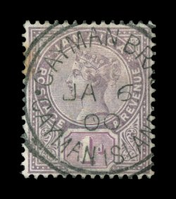 2034 O S.G. #Z26 imageS.G. #Z26, 1p Purple and mauve, possessing a superb central strike of "Cayman Brac/Cayman Islands/JA 6 00" double-circle c.d.s., Type Z5 pmk. being the very rare cancel of Stake Bay, Type 2 small tone spot at left, but very attractive and an extremely fine example of this cancellation; only two examples of this value are recorded, the other also on this very early date of January 6, 1900; ex-Meredith, Green (Scott #A26). (Image) £3,000