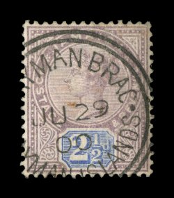 2036 O S.G. #Z28 imageS.G. #Z28, 2 1/2p Dull purple and blue, well centered stamp with strong clear strike of "Cayman Brac/Cayman Islands/JU 29 00" double-circle c.d.s., Type Z5 pmk. being the very rare cancel of Stake Bay, Type 2, very fine and a choice example of this elusive cancel; our records show that only two singles of this value, plus a strip of four in the Robert J. Cooley collection are recorded; ex-Meredith, Green (Scott #A28; $2,500.00). (Image) £2,500