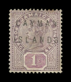 2037 E imageJamaica 1889 1p Purple and mauve with "Cayman/Islands" overprint in capital letters, an unused single with partial o.g., small gum stains on the reverse showing slightly to the front on a couple perf. tips at top, otherwise very fine; it is believed that this overprint was produced about 1891, the status of this overprint has never been fully determined, but it is believed by students to be an essay or an unissued value produced by the Jamaican Post Office for use in the Cayman Islands which was using Jamaican stamps there at that the time; its legitimacy has long been recognized because of the distinctive type of the first "A" in "Cayman" which shows a foot on the left leg, this same type irregularity is found on the 1/2p Green with thin "Official" overprint (copy enclosed for comparison), the official overprint was produced locally by C. Vendryes of Kingston, also the right upright of the "N" is short, another known type characteristic of this printer; whether an essay or an unissued overprint this example and the used example in the next lot are the only known surviving examples; a marvelous rarity of the early postal history of the Cayman Islands; these two stamps are specifically mentioned in the Stanley Gibbons introduction to Cayman Islands, but are not listed; 1988 Peter Holcombe certificate; ex-Meredith. (Image) Est. 5,000-7,500