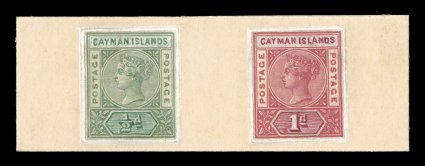 2040 E S.G. #1E-2E imageS.G. #1E-2E, 1900 1/2p and 1P Queen Victoria essays cplt., a similar set to the above, each an imperforate key-plate proof in the issued colors, both with country name and value tablets hand painted in colors similar to the key-plate design, both are affixed to a piece of card with the same white paint used to paint the labels also used to blend the borders of the essays onto the card, very fine pair of these extremely rare essays which are believed to be another of the three known sets; ex-Green (Scott #1E-2E). (Image) Est. 4,000-5,000